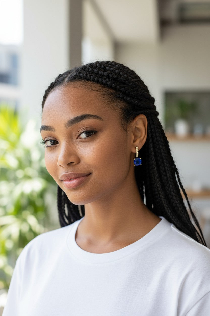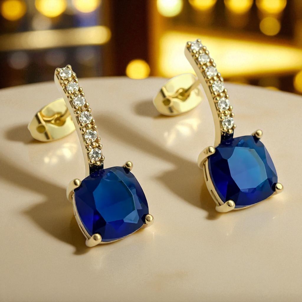 Un toque de sofisticación que nunca pasa desapercibido. Estos aretes están elaborados en materiales de alta calidad y adornados con una piedra azul intenso tipo zafiro, realzada por un detalle de cristales brillantes que iluminan cada movimiento. Perfectos para ocasiones especiales o para dar un aire elegante a tu look diario.