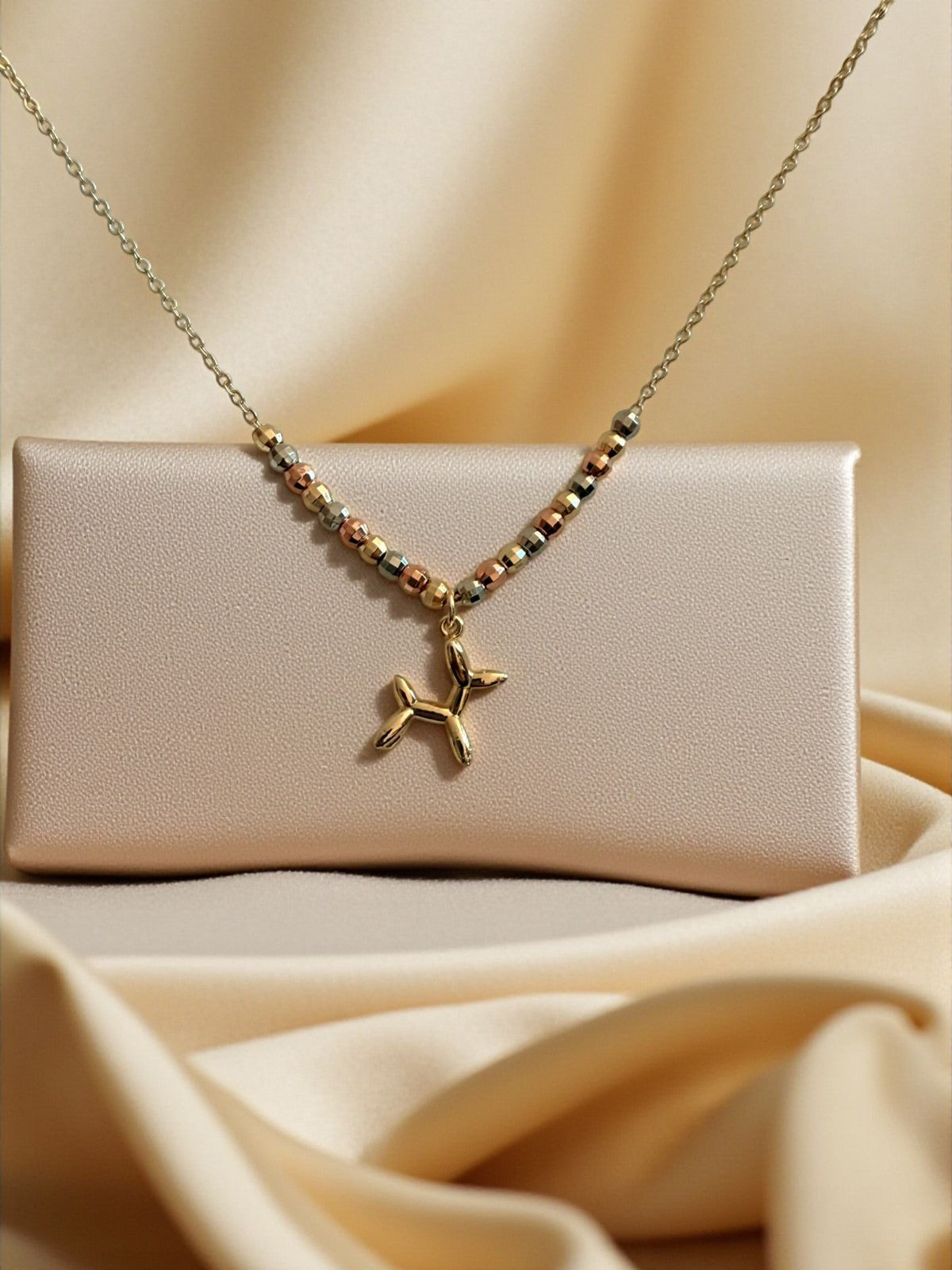 Collar con dije en forma de perrito globo en acabado dorado, acompañado de cuentas en 3 tonos. Un accesorio divertido y moderno, perfecto para petlovers que desean llevar siempre consigo un símbolo de amor.